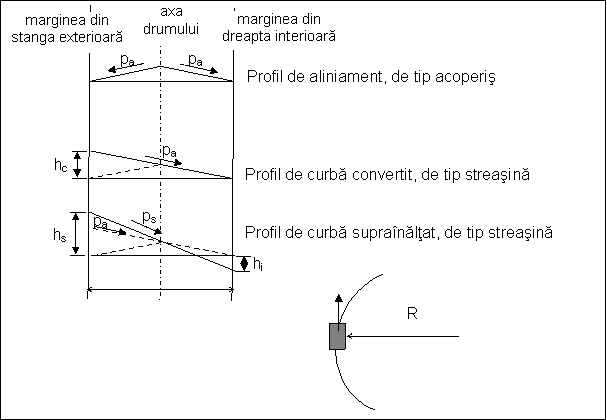 În curba, profilul transversal se converteste de la profilul de tip acoperis la profilul de tip streasina cu o singura inclinare spre interiorul curbei si avand panta transversala egala cu panta din aliniament, pa. Atunci cand, din cauza unor valori prea mici ale razelor curbelor, convertirea nu este suficienta pentru combaterea derapajului, se face si suprainaltarea caii prin sporirea pantei transversale de la pa la ps (figura 1.13). Valoarea ps este data in tabelul 1.1
