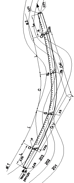 În figura 1.25 este reprezentata amenajarea supralargirii, iar in figura 1.26 este reprezentata amenajarea rampei suprainaltarii pentru curba data.