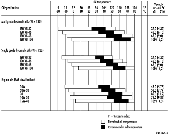 Tabelul de mai jos sunt aratate uleiurile recomandate pentru echipment. Cel mai potrivit ulei este selectat in asa fel incat temperatura uleiului hidrauic in continua folosire este in zona ideala a graficului.