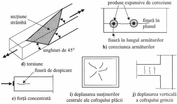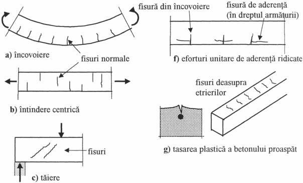 Fisurarea elementelor din beton armat sub incarcarile de exploatare este un fenomen inevitabil, fiind consecinta incapacitatii betonului de a prelua eforturile unitare de intindere produse de solicitari ca: incovoierea, taierea, torsiunea (fig.1ad), fortele concentrate de compresiune (fig.1e), sau de eforturi unitare de aderenta mari (fig.1f). De asemenea, o fisurare cu caracter intamplator poate fi produsa de efectele contractiei impiedecate a betonului, variatiei de temperatura si a tasarilor diferentiate ale reazemelor, tasarii plastice a betonului proaspat (fig.1g), actiunii inghetului si a dezghetului repetat, unor nereguli in tehnologiile de executie (fig.1i, j). Rezultatele fenomenului de coroziune al armaturii pot de asemenea produce fisuri in masa betonului (fig.1h).