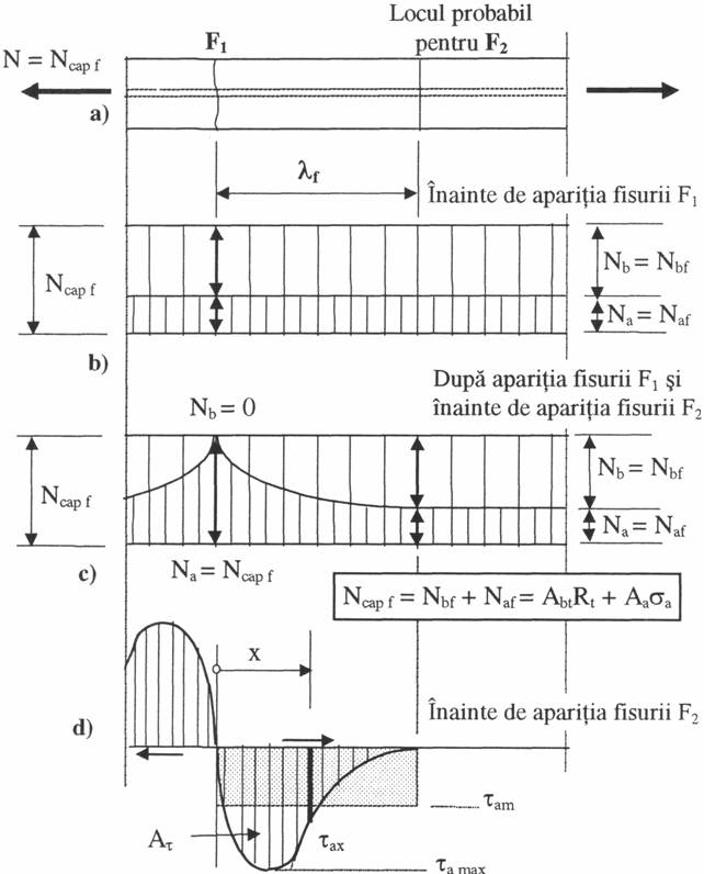 In sectiunea cea mai slaba se produce fisura F1. Dupa aparitia fisurii F1, aceasta sectiune trece in stadiul II cand Nb = 0 si Na = Ncap f (fig. 2c). Din dreptul acestei sectiuni, betonul incepe sa se incarce, iar armatura sa se descarce, la o anumita distanta lf ajungandu-se ca Nb = Nbf = AbtRt, iar Na = Naf.