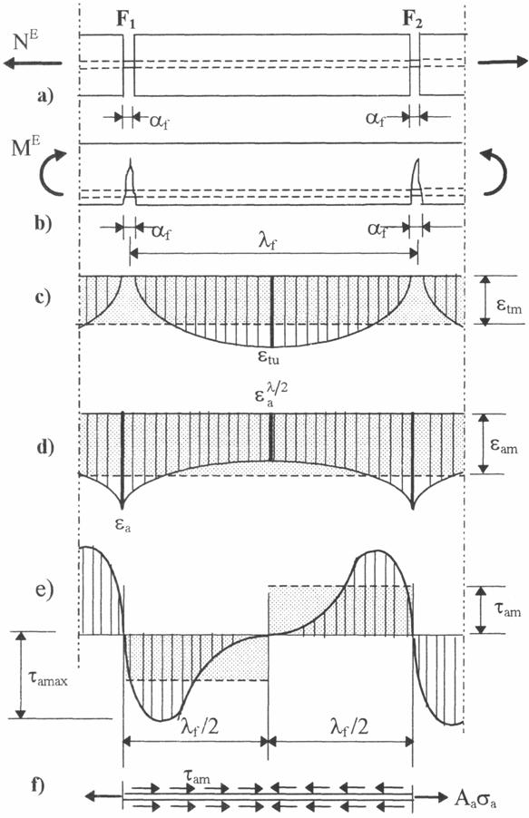 In figura 5 se considera un element intins centric, respectiv unul incovoiat cu fisurile F1 si F2 la distanta lf. Valoarea maxima a deformatiei specifice de intindere in beton este etu si apare la jumatatea distantei dintre fisuri (fig.5c), in timp ce alungirea maxima a armaturii este ea si apare in dreptul fisurii (fig.5d). Deformatiile specifice variabile pot fi inlocuite cu deformatiile specifice medii etm si eam (fig. 5 c,d).