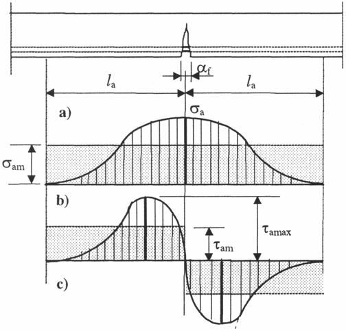 Transmiterea efortului de la armatura la beton, intre cele doua fisuri, se face prin intermediul eforturilor unitare de aderenta ta (fig.2d), marimea ce se transmite pe lungimea lf fiind Nbf = AbtRt. Relatia matematica ce exprima aceasta transmitere este: