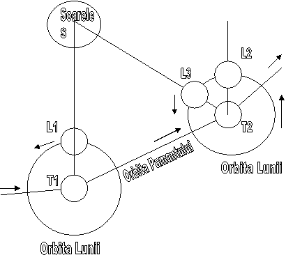 Pe de alta parte, Luna se roteste in jurul axei sale intr-o perioada de timp egala cu perioada de miscare in jurul Pamantului, fapt pentru care ea arata mereu aceeasi fata spre Pamant.In figura 1 am reprezentat soarele (S), Pamantul (T) si Luna (L), in pozitia initiala fiind socotite punctele : S,T1 si L1.Dupa un interval de timp egal cu perioada siderala a Lunii, cele trei corpuri se vor gasi in punctele : S,T2 si L2.Pentru ca Luna sa ajunga iarasi in pozitie coliniara cu Soarele si Pamantul, in L3, va trebui sa mai treaca un anumit interval de timp.In modul acesta se vede ca perioada sinodica - interval de timp dintre doua conjunctii este mai mare decat perioada siderala.Perioada sinodica se determina observational si este egala cu 29 zile, 12 ore, 44 minute si 2,8 secunde.