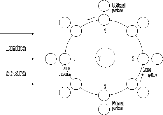 Faza ,,Luna Noua" o avem atunci cand spre Pamant este orientata suprafata neiluminata de Soare.Apoi apare o fasie iluminata, o ,,secere", care creste din ce in ce mai mult pana cand Luna ajunge la 900 fata de pozitia corespunzatoare fazei ,,Luna Noua".In acest timp spre observatorul terestru va fi orientata jumatate din jumatatea iluminata a suprafetei lunare si avem faza ,,Primul Patrar"