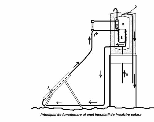 O instalatie de incalzire solara se compune in general din trei parti: captare, stocare si distribuire.Captarea este realizata, in general, cu insolatoare plane I (vezi figura de mai jos) cu efect de sera. Stocarea se face intr-un rezervor de apa R care este legat prin conducte bine isolate de sistemul de captare. Apa calda obtinuta, fiind mai usoara decat cea rece, se acumuleaza in partea superioara. Rezervorul se aseaja, in general, vertical, conducta de iesire pentru apa calda D, fiind plasata sus, iar cea de alimentare cu apa rece A este situata in partea inferioara. Distributia este, in general, aceeasi ca la instalatiile uzuale.