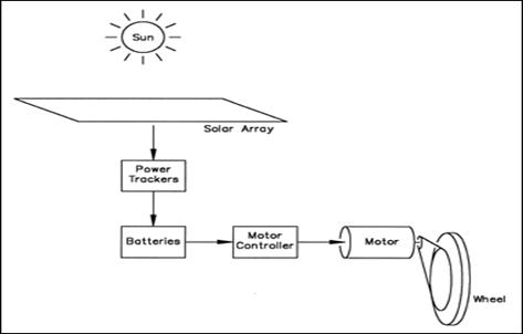 In principal, modul de functionare al unui automobil cu propulsie fotoelectrica ar fi urmatorul:energia solara ce cade pe panourile masinii este furnizata unei baterii de acumulatoare.La nevoie, energia electrica furnizata de acumulatoare este transmisa unui motor electric de curent continuu ce propulseaza masina.In cazul in care deplasarea se face in plin soare, energia furnizata de panouri serveste direct propulsiei, acumulatorii fiiind silicitati numai atunci cand este umbra sau vehiculul urca pe o panta abrupta.