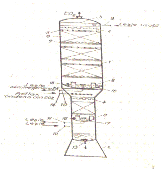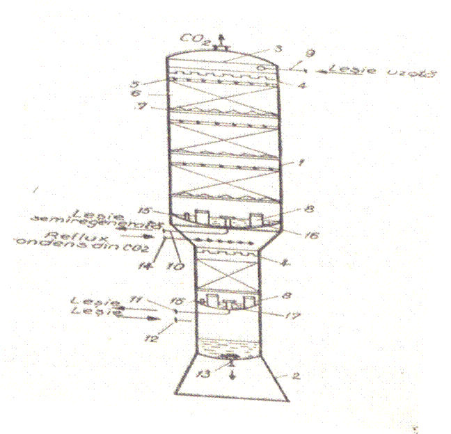 Gazul convertit , cu 17%CO2 si 27 ata cedeaza caldura in fierbatoarele 11 , trece prin separatorul de condens 1 , iar de aici , cu 700C , intra in coloana de absorbtie 2 la partea inferioara a acesteia . Coloana este umpluta cu sei ceramice , asezate pe mai multe straturi , stropite la varf cu lesie Carsol regenerate , iar la mijloc cu lesie semiregenerata .
