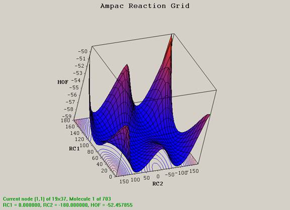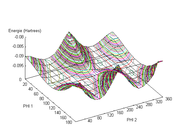 Se deschide fisierul "vis" si se vizualizeza filmuletul tuturor conformerilor pentru care s-a calculat energia totala datorata modificarilor celor doua unghiuri diedre.