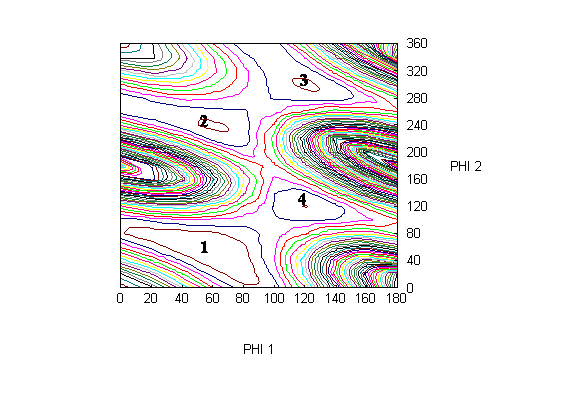 Cum se obtine suprafata de energie potentiala? Vom calcula energiile conformatiilor optimizate obtinute prin varierea ungiurilor diedre φ1 si φ2, astfel: