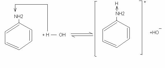 In solutie, anilina ionizeaza ca si amoniacul, acceptand protoni pe care ii fixeaza la perechea de electroni neparticipanta a atomului de azot printr-o legatura covalent coordinativa :