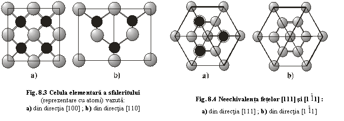 - în directia [100] (fig.8.3a) alterneaza plane de atomi de Zn cu plane de atomi de S (coeziune minima); distanta dintre plane d[100]=1,35 Ĺ;