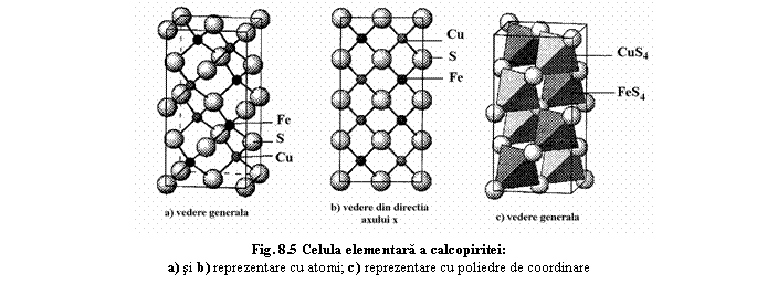 Coordinarea (fig.8.5c): - atomii de S coordinati tetraedric de 2 atomi de Cu si 2 atomi de Fe;