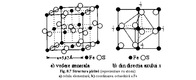 Structura (fig.8.7a) poate fi descrisa pornind de la structura galenei (tip halit): pozitiile Pb(Na) sunt ocupate de Fe, pozitiile S(Cl) de perechi S2 (grup molecular S22-), astfel încât centrul de simetrie al perechii S2 ocupa pozitia centrului anionului din structura tip halit.