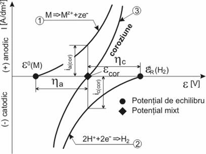 Deplasarea celor doua potentiale de echilibru, la potentialul de coroziune este o consecinta a fenomenelor de polarizare anodica ( a si catodica ( c) a proceselor de electrod, fenomen ce apare instantaneu la contactul metal - mediu.
