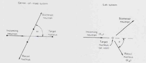 Figura 15-12. Diagrama imprastierii elastice a netronilor in coordonatele centrului de masa si in coordonatele laboratorului
