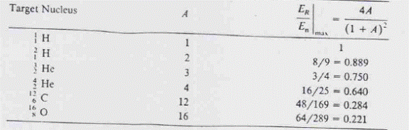 In tabelul 15-2 avem lista fractiilor maxime de energie pe care neutronul incident le poate ceda nucleului de recul intr-o singura coliziune pentru diferite nuclee tinta. Cu cat masa nucleului tinta creste, proportia maxima de energie transferata scade. Numai in coliziune cu hidrogenul obisnuit poate neutronul sa transfere toata energia sa dintr-o singura interactie. Dupa cum se poate vedea din tabel, numai nuclee usoare prezinta interes in detectoarele recul, unde hidrogenul are un rol important.