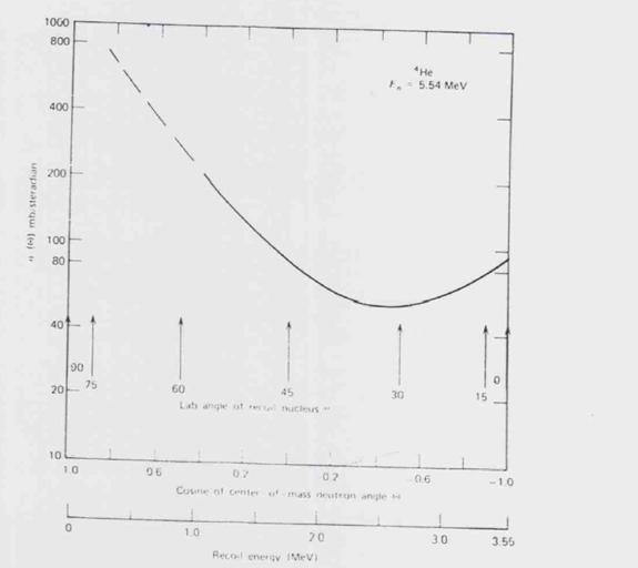 Figura 15-13. Diferite sectiuni macroscopice de imprastiere ale 3He la o energie a netronilor de 5.54 MeV. Sunt indicate de asemenea unghiurile si energiile corespunzatoare nucleelor de recul de He in sistemul laboratorului.