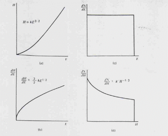 Figura 15-16. Graficul inaltimii pulsului fata de energia unui scintilator tipic organic. Acest raspuns nonlinear conduce la o distorsiune a spectrului protonului recul rectangular din fig. c in fig d