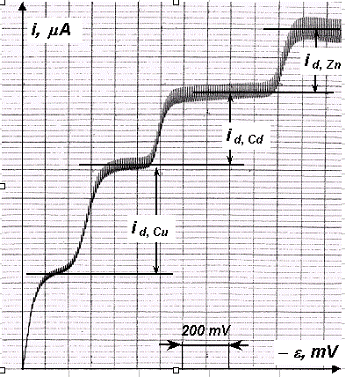 Unda polarografică prezentată în Fig. 2 prezintă o treaptă unică, ce corespunde unui proces de electrod unic. Atunci când proba prezintă mai multi constituenti electrochimic activi, sau analitul poate participa la procese succesive de electrod, înregistrarea polarografică corespunzătoare poate prezenta o succesiune de trepte polarografice. Această posibilitate se exprimă prin selectivitatea metodei si va fi aplicată în laborator la determinarea cationilor Cu2+, Cd2+ si Zn2+ în amestec.