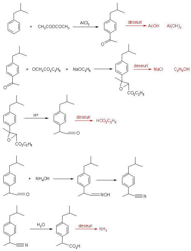 Ibuprofenul a fost dezvoltat ca un nou analgezic de compania Boots la mijlocul anilor 1960, utilizand o ruta destul de ineficienta. Desi metoda este o demonstratie eleganta a chimiei organice clasice aplicate, aceasta utilizeaza in principal reactivi stoichiometrici si nu catalizatori, conducand la cantitati mari de deseuri.