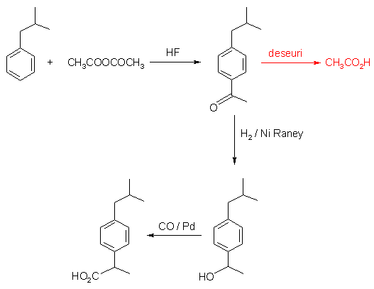 Acest lucru se intampla pana ca medicamentul sa fie patentat, deschizand o competitie in inbunatatirea procesului. Fabricarea ibuprofenului se face la ora actuala pe o ruta mult mai simpla. Toate etapele din procesele prezentate sunt catalitice; o nota particulara este utilizarea unor cantitati catalitice de HF in locul cantitatilor stoichiometrice de AlCl3 in reactia de acilare initiala. Chiar daca utilizarea HF produce o cantitate mai mica de deseuri, lucrul cu acesta ridica probleme de lucru - acesta este unul dintre exemplele de nevoie de a alege intre diferitele principii ale chimiei verzi in detrimentul celorlalte.