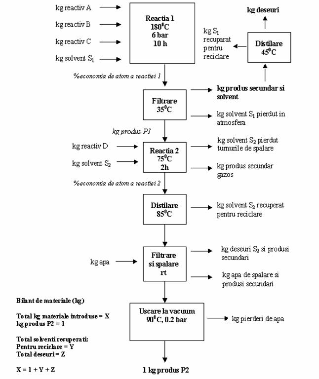 Din diagrama procesului se poate calcula bilantul general de materiale; apa utilizata trebuie inclusa in acest bilant deoarece este foarte important calculul bilantului energetic din care se determina eficienta etapei de distilare si se evalueaza optiunile de tratament ale deseurilor. Pentru evaluarea diagramei procesului, etapele incluse se pot compara in urmatorii termeni: volum de deseuri, natura deseurilor, bilant de materiale, contaminarea produsului, costul materialelor finite, complexitatea procesarii si costurile asociate acesteia, necesitatea oricarui echipament special, necesarul energetic, toxicitatea si usurinta de manuire a materialelor implicate. Aceasta va conduce la o micsorare a numarului de posibile cai de realizare. Exista o serie de intrebari care pot fi generate de un astfel de studiu precum: