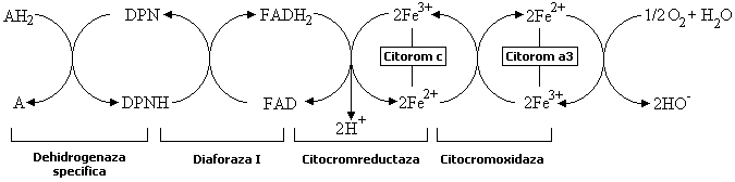 Nici în conditii aerobe, hidrogenul din hidrocodehidraza nu este cedat direct unei molecule de oxigen, ci el este întâi transferat altor sisteme enzimatice care abia ele pot reactiona cu oxigenul. Sunt mai multe cai posibile prin care hidrogenul substratului poate ajunge la oxigen. Un astfel de lant de reactii este redat în urmatoarea schema.
