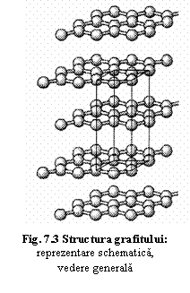 Legatura de tip σ dintre atomii de C hibridizati sp2 determina formarea unei retele plane cu ochiuri hexagonale în care un atom de C este coordinat planar de alti 3 atomi de C, unghiul de legatura fiind de 120° (fig.7.3); d(C-C)=1,415 Ĺ în interiorul retelei plane. Retelele planare sunt legate între ele în directia axului c prin forte slabe, Van der Waals, distanta dintre plane fiind 3,36 Ĺ. Aceasta legatura este determinata de existenta electronilor din orbitalii pz.
