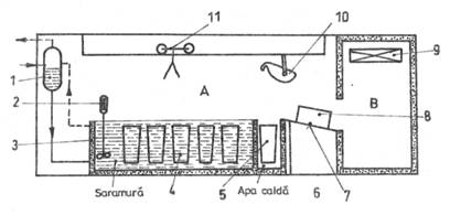 Schema functionala a fabricii pentru producerea blocurilor de gheata prin racire indirecta A-sala generatorului de gheata; B-depozitul de gheata 1-separator de lichid; 2-agitator de saramura; 3-bazinul generatorului de gheata; 4-forme cu apa supuse congelarii; 5-forme cu gheata supuse decongelarii; 6-bazin pentru decongelare; 7-masa cu suprafata înclinata; 8-bloc de gheata; 9-racitor de aer; 10-umplutor basculane; 11-pod rulant |