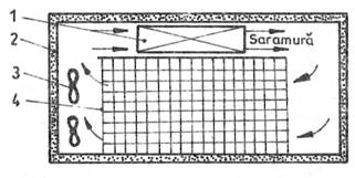 Bazinul cu saramura pentru producerea blocurilor de gheata prin racire indirecta 1-vaporizator imersat; 2-bazin metalic izolat termic; 3-agitatoare; 4-forme pentru blocurile de gheata |