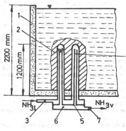 Bazinul pentru formarea ghetii prin procedeul Grasso 1-bazin izolat termic; 2,4-conducte coaxiale; 3-alimentare cu agent frigorific lichid; 5-perete despartitor; 6-cutie; 7-evacuarea vaporilor de agent frigorific |
