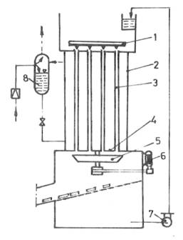 Schema de principiu a generatorului de gheata tubulara 1-dispozitiv de asigurare a curgerii peliculare; 2-manta cilindrica izolata termic; 3-tevi verticale; 4-placa tubulara; 5-cutit pentru taierea ghetii; 6-motor electric; 7-pompa; 8-separator de lichid |