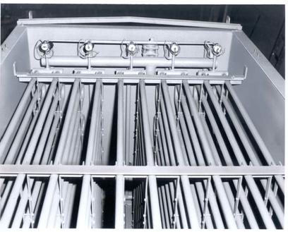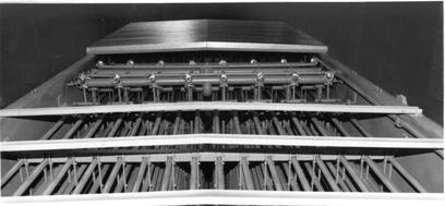 Podul rulant ridica jugul cu formele aflate la sfârsitul procesului de congelare si asigura coborârea jugului cu formele în care se gasesc blocurile de gheata, în bazinul pentru decongelare.