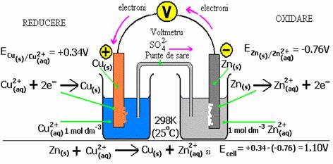 Cand circuitul electric este inchis la electrozi au loc simultan urmatoarele reactii electrochimice care genereaza curentul electric: