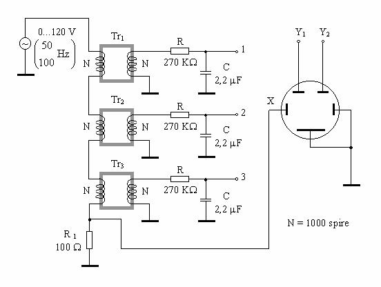 Principiul de masura a fost prezentat in sectiunea I.B. Cu ajutorul schemei din figura se vor vizualiza pe osciloscop curbele de histerezis dinamic pentru un material feromagnetic (circuit magnetic inchis) Tr1 si pentru un material ferimagnetic in doua variante: Tr2 ( circuit magnetic inchis) si Tr3 (circuit magnetic cu intrefier). Infasurarile celor 3 transformatoare sunt identice ca geometrie si numar de spire (N = 1000 spire).