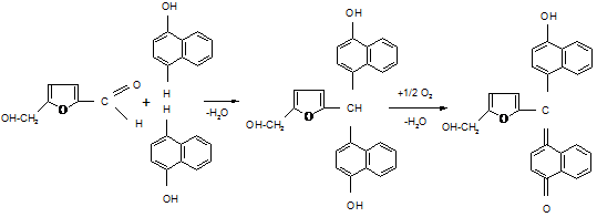 In urmatoarea schema se reda obtinerea hidroximetilfurfurolului din glucoza si condensarea acestuia cu a-naftolul.