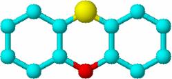 Pentru a obtine matricea de distante pentru fenoxatina, compus cu actiune antimicrobiala [76] , structura acestui compus este modelata cu ajutorul pachetului de programe Hyperchem [77]. Fisierul obtinut cu extensia .hin este transformat intr-un fisier cu extensia .mpn cu ajutorul programului BabelWin [78]. Pentru ca acest fisier sa poata fi utilizat de WinMopac sau Mopac, in scopul obtinerii matricei de distante se pot utiliza urmatoarele cuvinte cheie : THERMO ROT=1 GEO-OK mmok precise CHARGE=0 GNORM=0.1 BONDS VECTORS DENSITY a caror semnificatie se regaseste in referinta [74]. In Figura 22 sunt prezentate formula moleculara, graful constitutional si matricea de distante pentru fenoxatiina.