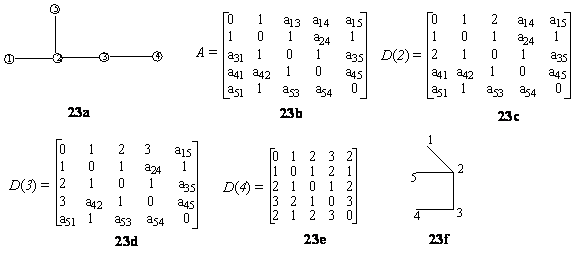 incomplete (23c, 23d); matricea de distante D completa (23e); graful 2-metilbutanului construit din matricea de adiacenta A (23f)