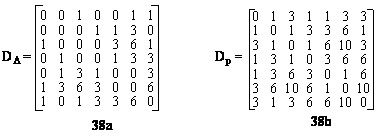 Figura 38. Matricile combinatoriale DD (38a) si Dp (38b) in cazul grafului molecular caracteristic 1-etil-2-metilciclobutanului