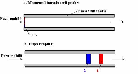 Moleculele celor doi compusi, 1 si 2 care se gasesc īn momentul initial ametecate, īntr-un volum restrāns, vor avea tendinta de a se transfera continuu din faza mobila īn faza stationara si invers, din cauza agitatiei termice. Deoarece moleculele compusului 2 au o afinitate mai mare fata de faza stationara, ele vor fi mai puternic retinute īn aceasta faza. Drept urmare, dupa un anumit interval de timp se va īnregistra o ramānere īn urma a acestei componente, comparativ cu componenta mai slab retinuta 1. Trebuie remarcat faptul ca aceasta separare are loc īn timpul deplasarii īn coloana, deci este in proces dinamic.