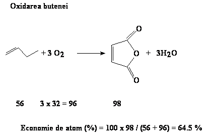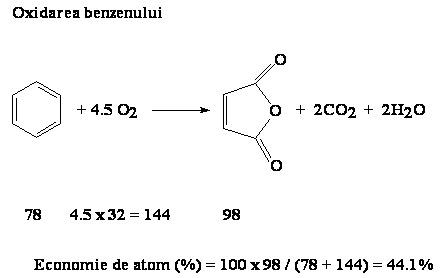 Economie de atom (%) = (masa moleculara a produsului dorit / masa moleculara a tuturor reactantilor) x 100