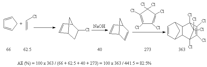 O ruta de reactie cu economie de atom este si cea de fabricare a insecticidului "aldrin" pusa in practica cu 50 ani in urma. Acest insecticid deosebit de puternic a fost insa abandonat mai tarziu in mult tari datorita toxicitatii sale avansate. Acest exemplu ilustreaza necesitatea abordarii unui proces din toate punctele de vedere, nu doar ca ruta de sinteza.