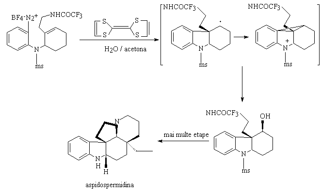Una dintre cele mai usor oxidabile si mai disponibile sulfuri este tetratiofulvalena (TTF) un astfel de material fiind capabil sa transfere electroni la electrofili precum sarurile aren-diazoniu. Reactia este utilizata in formarea precursorilor triciclici utilizati in fabricarea aspidospermidinei, pe cale stereospecifica: