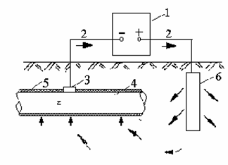 Fig. 9.25. Schema de principiu a protectiei catodice cu sursa exterioara de curent: 1 sursa de curent continuu; 2 conductori de legatura; 3 punct de drenaj; 4 conducta; 5 izolatie; 6 priza anodica