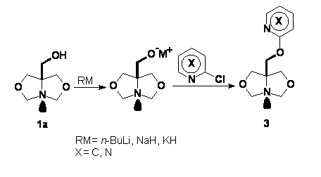 Preliminar, s-a investigat O-metalarea lui 1a. Numai derivatul O-potasat al acestuia s-a dovedit util efectuarii in continuare a sintezelor. Reactia a fost apoi testata asupra 2-cloropiridinei, obtinandu-se derivatul 3 (X = C, Schema 3) cu un randament in substanta izolata de 60%. 2-Bromopiridina, in schimb, s-a aratat inerta fata de reactivul nostru (pledand astfel pentru un mecanism SN2Ar via complex Jackson-Meisenheimer) in vreme ce, in cazul 4-cloropiridinei, a fost observata doar descompunerea amestecului de reactie.