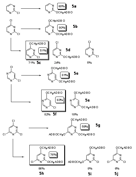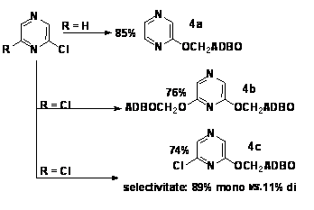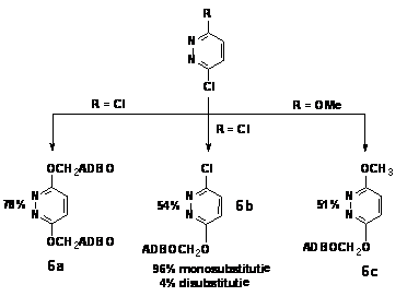 b) in cazul prepararii derivatului metoxi-3,6-disubstituit al piridazinei (Schema 6) pornind din 3-cloro-6-metoxipiridazina, principala impuritate identificata ca produs secundar (si care explica randamentul, oarecum mai modest) a fost, in mod neasteptat, derivatul simetric-3,6-disubstituit cu resturi 5-(-O-CH2-)ADBO, identic cu cel izolat si caracterizat din reactia de substitutite exhaustiva a 3,6-dicloropiridazinei. Am fost astfel nevoiti sa acceptam deplasarea, de catre nucleofilul nostru, a anionului metoxi, mai putin nucleofil (si, eventual, mai puternic bazic).