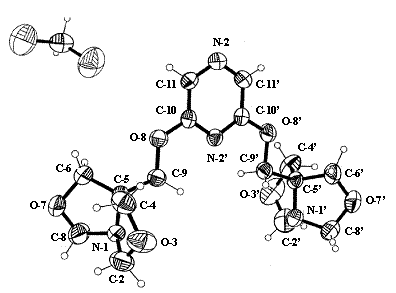 Insusirile chelatizante, remarcabile ale noii clase de compusi sintetizati, au fost puse in evidenta prin analiza structurala a derivatului pirazinic 2,6-disubstituit cu resturi 5-(-O-CH2-ADBO). Diagrama ORTEP a acestuia este redata in Figura 1.