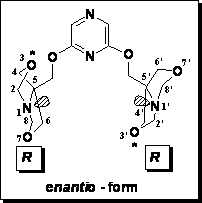 a) o forma chirala, cu pondere de cca. 87%, a carei diagrama este reprezentata in Figura 1 (unul dintre enantiomeri); asimetria de ansamblu provine din chiralitatea de acelasi sens a celor doua bicicluri (R,R in cazul de fata, vezi shema simplificata si incadrata)