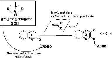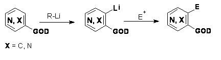 Metodologia functionalizarii prin orto-metalare este prezentata in Schema 7. Aceata consta in deprotonarea, in orto fata de o grupare directoare (denumita simbolic GOD), cu o baza tare. In continuare, intermediarul litiat poate reactiona cu diversi electrofili. Pentru evitarea reactiei de aditie nucleofila se lucreaza cu agenti de metalare putin nucleofili: LDA (di-iso-propilamidura de litiu) si LTMP (2,2,6,6-tetrametilpiperidilamidura de litiu).